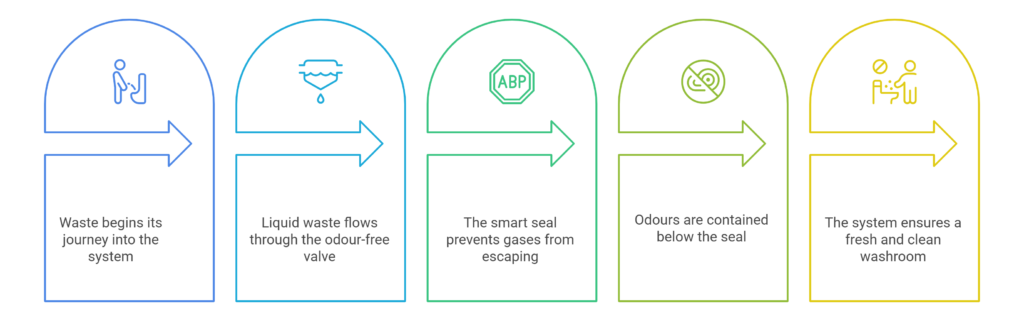 Traditional urinals rely on frequent flushing, leading to water wastage and persistent odour issues. V-Tech Odour-Free Urinal Kits use advanced sealing technology to block sewer gases and prevent odour escape, ensuring a cleaner, more hygienic washroom environment without continuous water use.